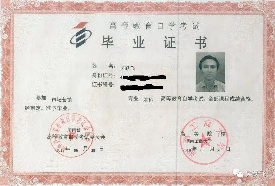 六、学习方式免试入学,以辅导和自学相结合。考试时间:4月、10月统考课程考试;5月、11月证书课程考试。考试地点:统考课程在省招生考试院统一安排的考点;证书课程在北京,由助学单位安排。 七、毕业证书每年6月、12月统一办理毕业。成绩全部合格者,由湖南商学院和湖南自考委联合颁发教育部电子注册的本科毕业证书 八、报名条件凡具有国民教育系列大学专科以上学历者(或大专在读),均可报名参加本专业考试。 九、报名资料本人居民身份证扫描件1份;蓝底数码照电子版1份;专科已毕业的提供专科毕业证扫描件1份。